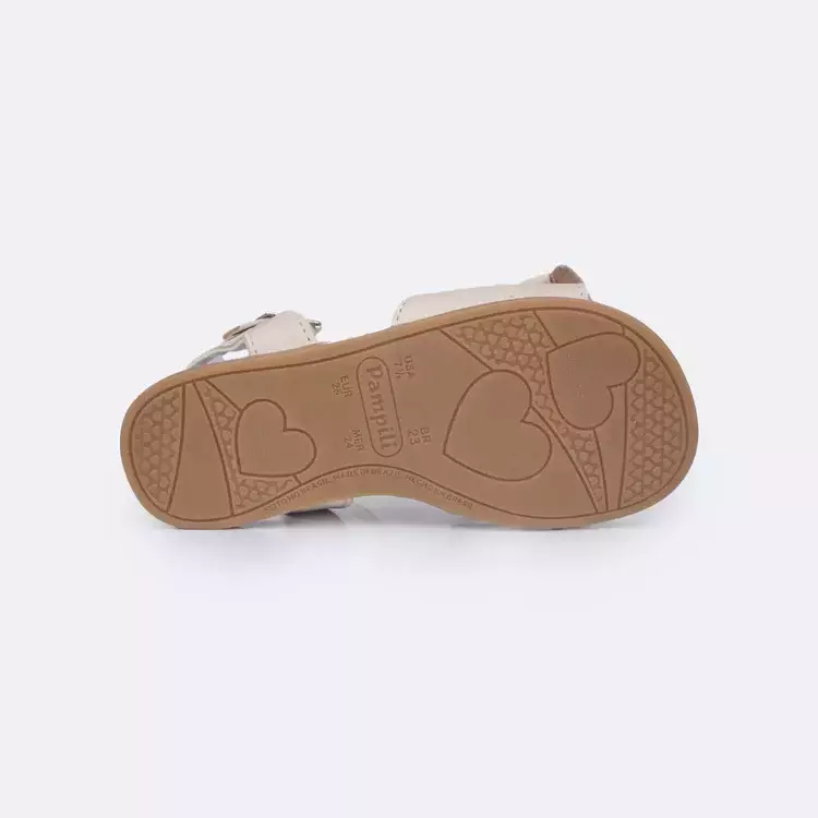 Sandália infantil feminina em sintético areia, com laço na parte frontal e detalhe de coração metalizado no centro, fofa e delicada para os primeiros passinhos! Palmilha com espuma para mais conforto ao caminhar. A sandália de bebê tem solado emborrachado flexível e antiderrapante, proporcionando maior segurança e aderência ao chão. Sandália infantil fácil de calçar com fivela easy, sem pino no fechamento, uma tecnologia desenvolvida pela nossa equipe para trazer praticidade para a mamãe.