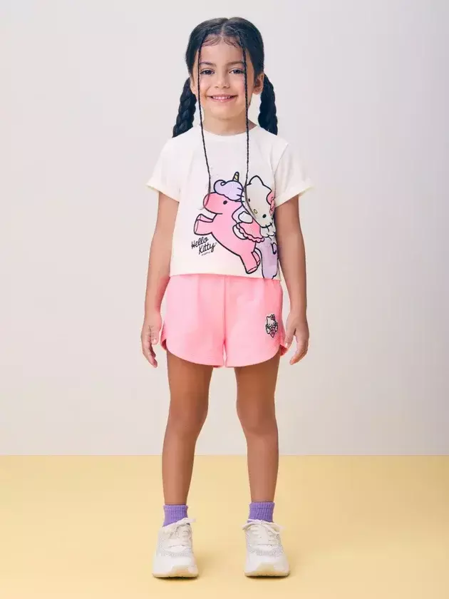 Para quem busca um look delicado e cheio de charme, esse conjunto é a escolha certa! A blusa off white traz a Hello Kitty em uma estampa fofa e aplicação de strass no lettering e detalhes, que adicionam um brilho sutil e encantador. Acompanhando, o short rosa com estampa rotativa da personagem traz cós elástico para um ajuste perfeito e detalhes que deixam o look ainda mais divertido. Um conjunto que une conforto, estilo e aquele toque lúdico que só a Momi sabe criar. Ref.: J6818