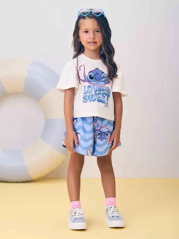 Encante-se com esse conjunto super fofo do Stitch! A camiseta off white é destaque com estampa exclusiva do personagem, aplicação de strass para um toque brilhante e a frase "Lovely & Sweet", que traduz o mood da peça. Acompanha um short confortável com estampa rotativa do Stitch sobre fundo azul em padrão ondulado, garantindo um visual alegre e descontraído para os passeios e momentos de diversão. Ref.: J6847