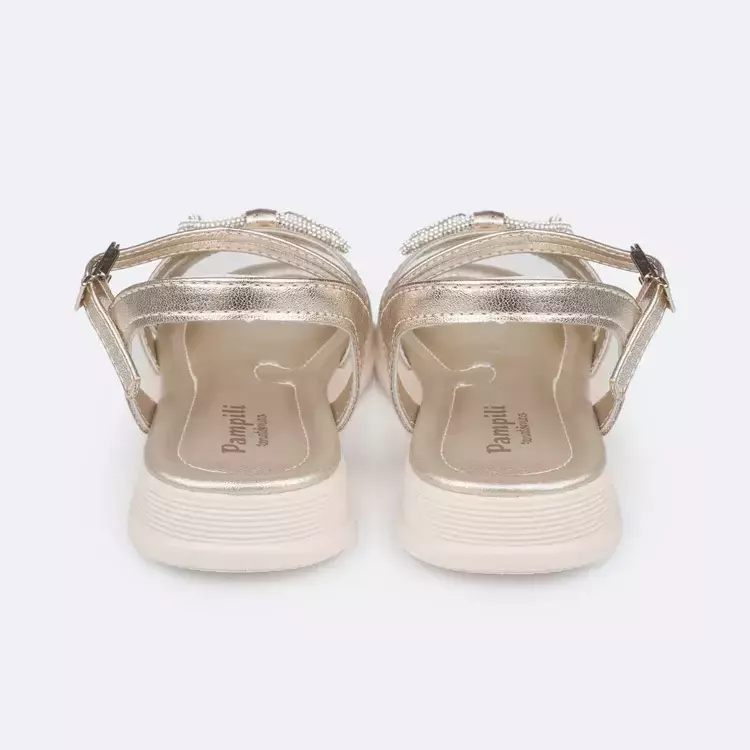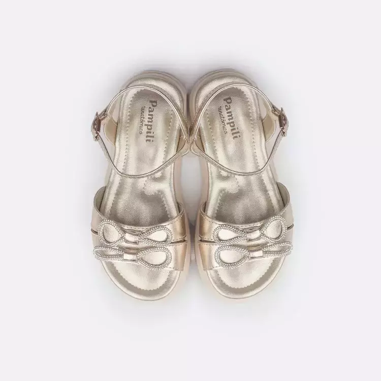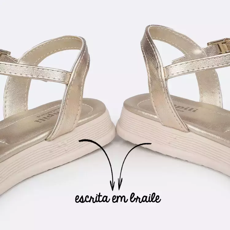 Sandália infantil feminina em sintético dourado com lacinhos em cordão de strass na parte superior, estilosa para todos os momentos. Sandália com palmilha anatômica, cuidando sempre do bem estar dos pezinhos. Solado com pequena elevação em micro expandido, material leve com muita aderência e estabilidade, além da flexibilidade, resistência térmica e alto desempenho antiderrapante. Sandália calce fácil com fivela Easy, muito prática para a autonomia das meninas ao calçar! A sandália vem com escrita em braile nas laterais, mostrando o lado correto para as meninas cegas ou com baixa visão.